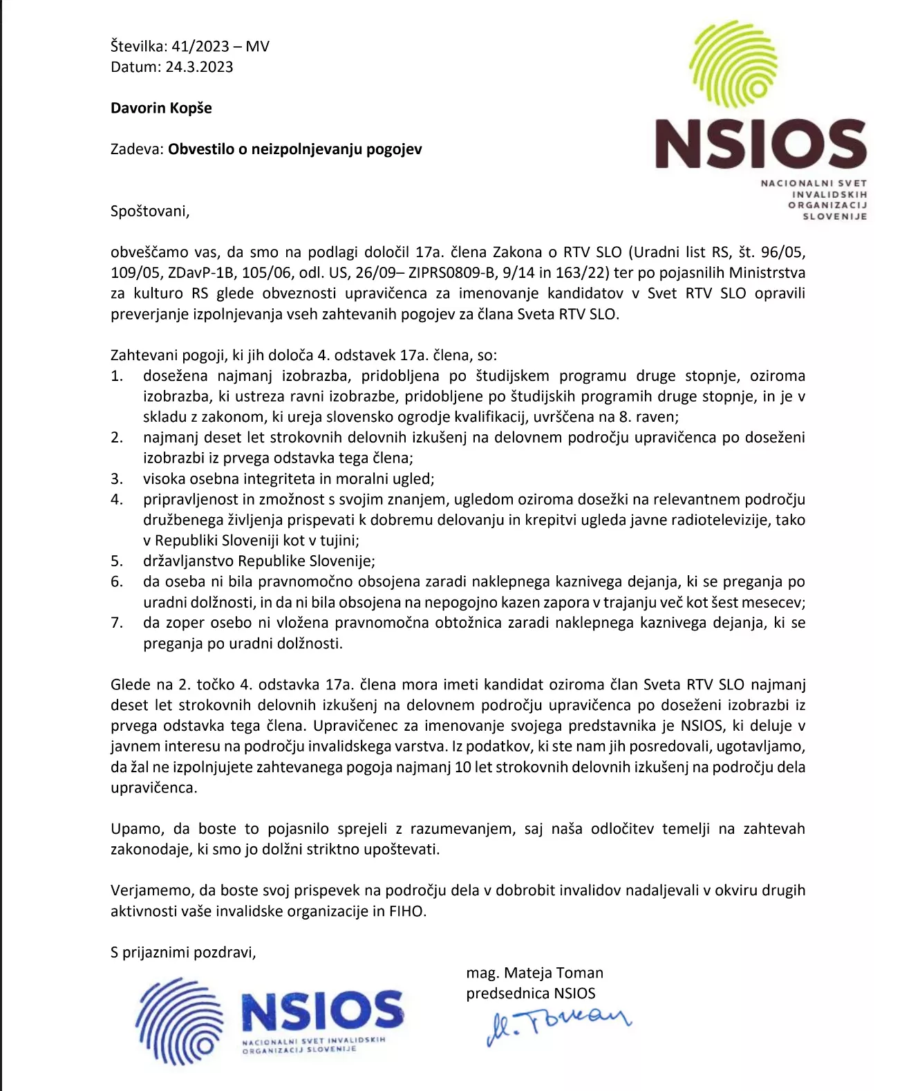 NSIOS je eden od upravičencev za imenovanje enega člana Sveta RTV. Dne 13. 1. 2023 je v skladu z zakonom objavil javni poziv za imenovanje članov Sveta RTV. Zveza paraplegikov Slovenija me je predlagala kot kandidata. Sedem člansko predsedstvo NSIOS je kot organ tega sveta odločalo o petih kandidatih. Ker se najprej niso mogli dogovoriti/odločiti, so vse kandidate povabili na predstavitev. Po predstavitvah je isto predsedstvo na tajnem glasovanju odločilo; en glas je bil vzdržan, dva kandidata sta prejela po nič glasov, dva po en glas, sam pa sem prejel štiri glasove.