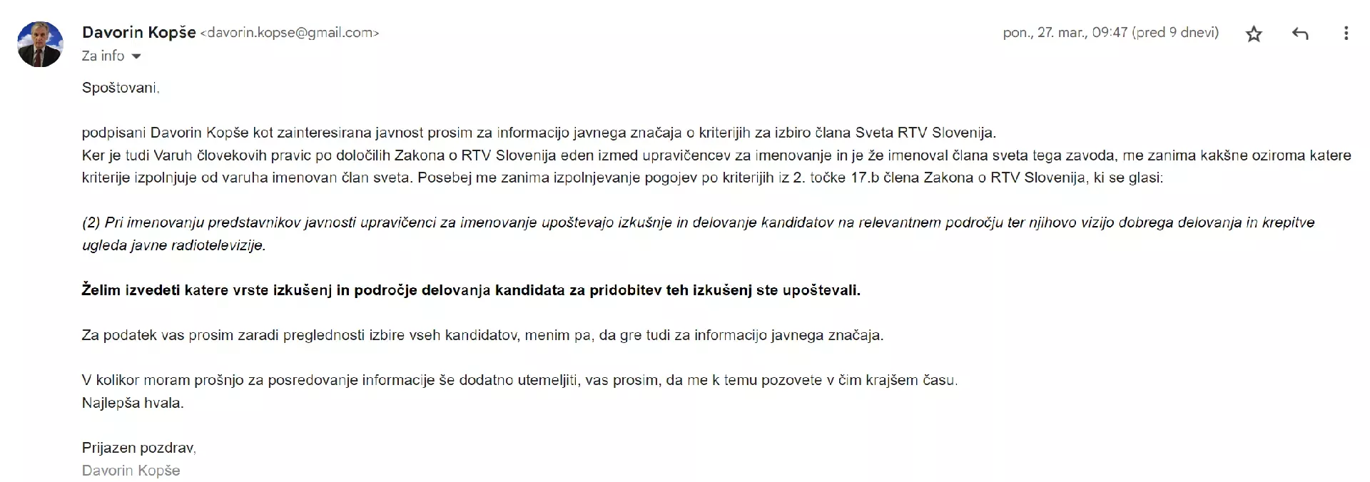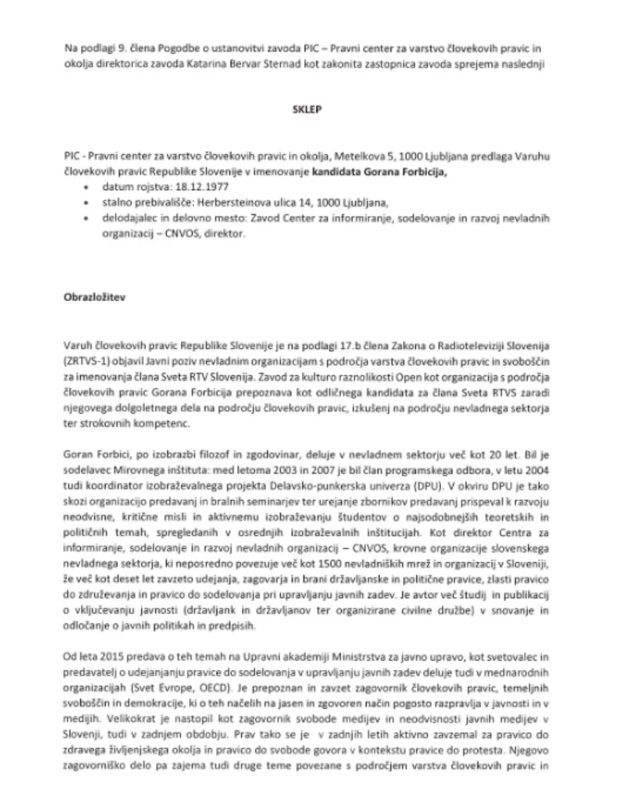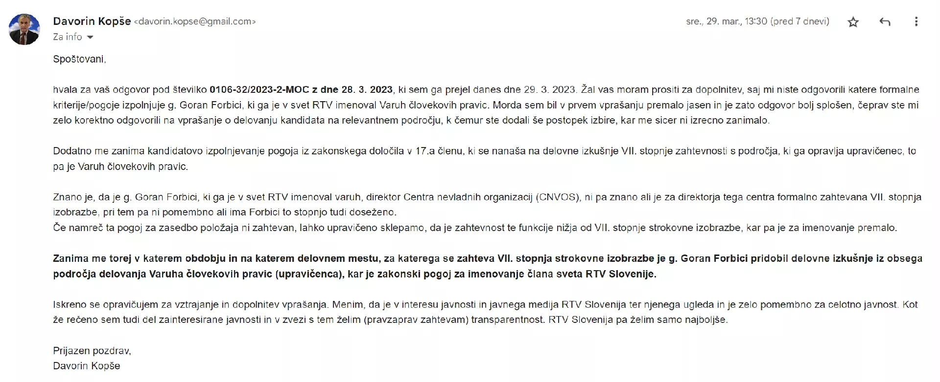 Prav tako me niso zanimale splošne izkušnje imenovanega v Svet RTV g. Gorana Forbicija, ampak konkretne izkušnje, ki jih zahteva zakon o RTV Slovenija.