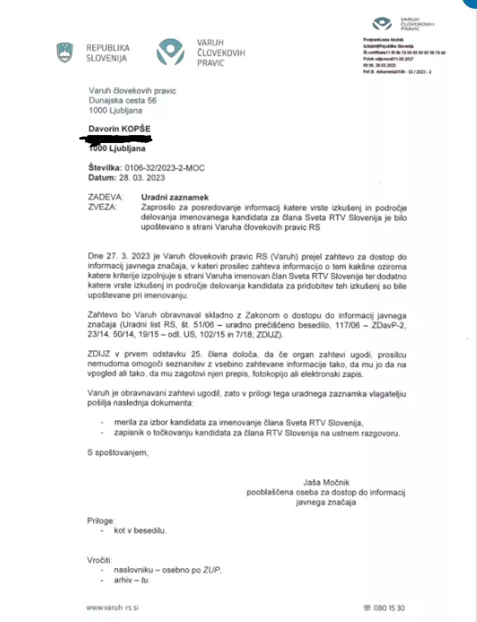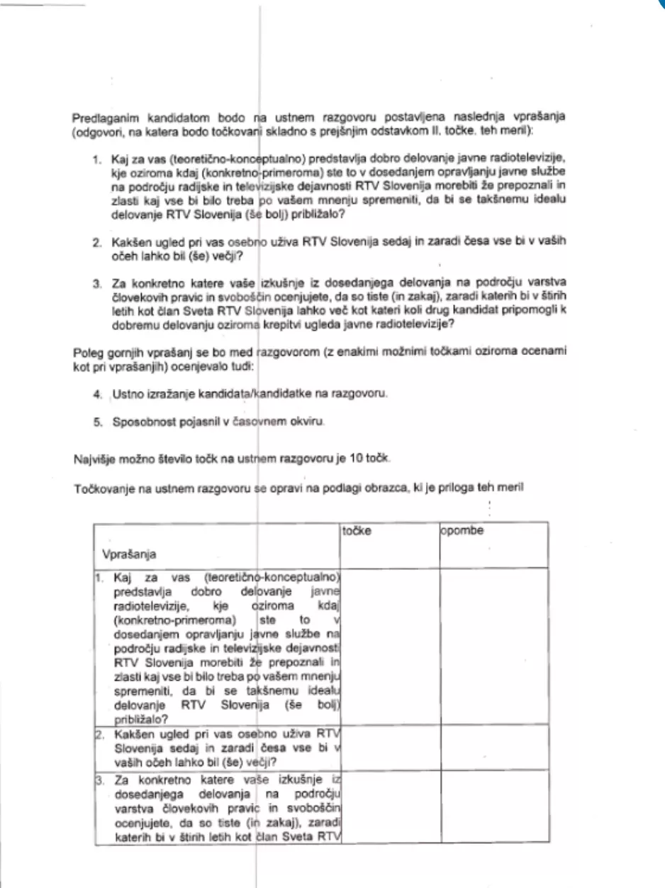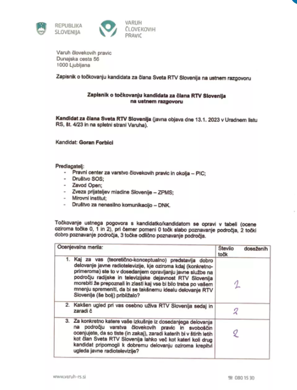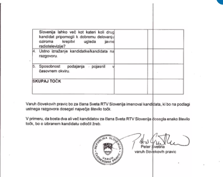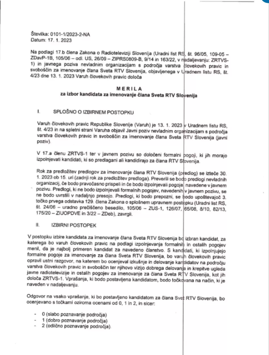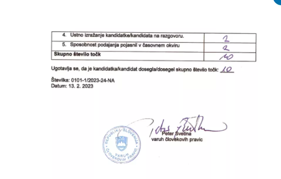 Iz urada Varuha človekovih pravic so mi posredovali uradni zaznamek o ugotovitvi, da gre za IJZ, kopije meril za izbor kandidata ter zapisnik o točkovanju: