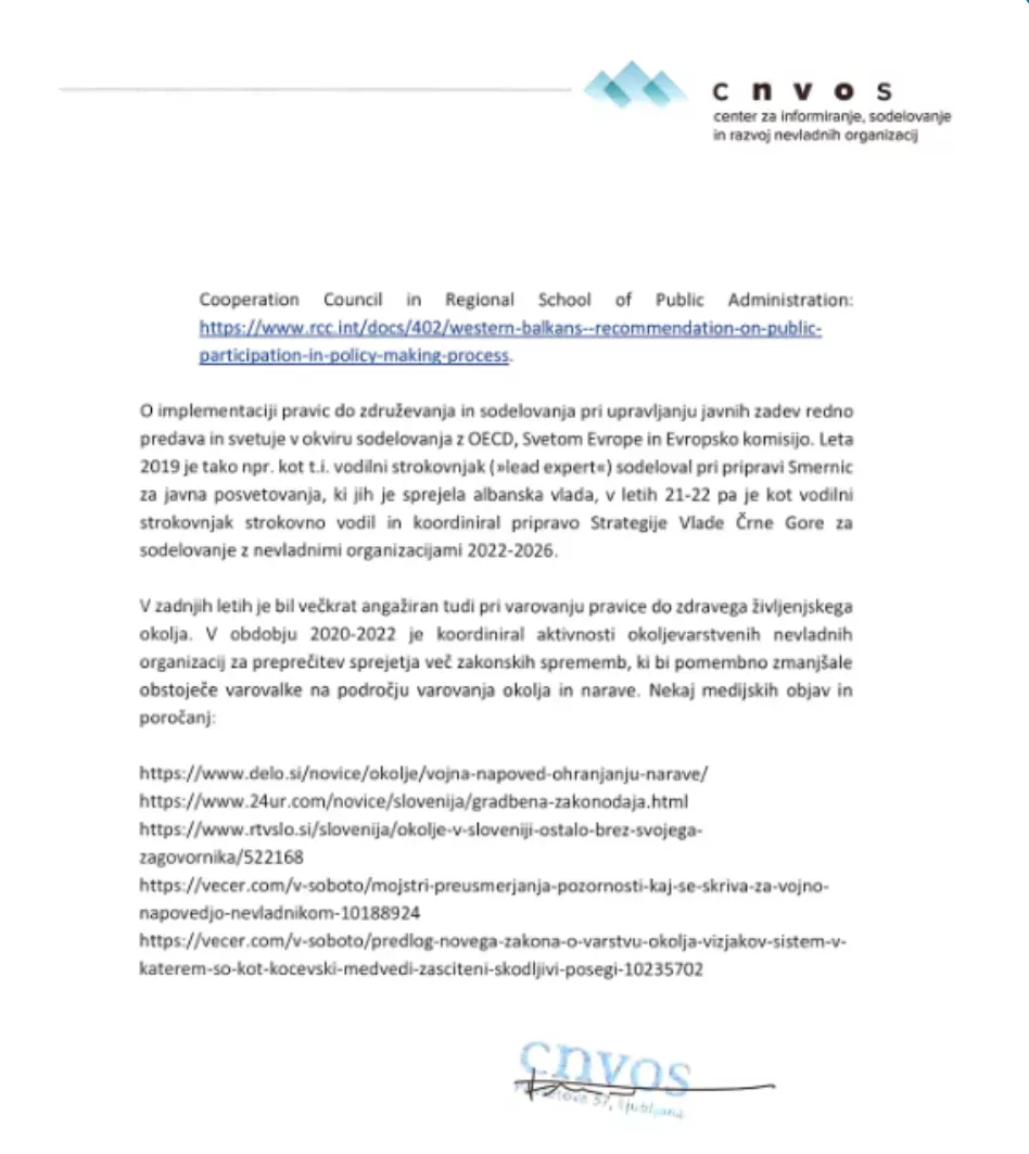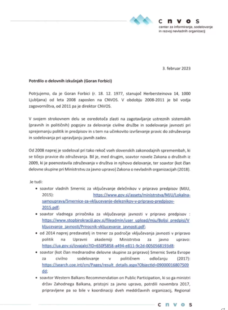 Ta je morda še najbolj zanimiv. Na mojo elektronsko pošto so mi ekspresno odgovorili z navadno priporočeno pošto s povratnico. Odgovor je zelo splošen, iz njega pa je mogoče sklepati, da tudi njihov kandidat ob imenovanju ni izpolnjeval konkretnega zahtevanega pogoja. Gre namreč za direktorja Centra nevladnih organizacij z Metelkove 6. Za to delovno mesto ni mogoče nikjer izslediti podatka ali se za zasedbo delovnega mesta direktorja tega centra sploh zahteva kakršnakoli stokovna izobrazba. Kot vemo, nevladne organizacije za delovanje znotraj svojih področij ne zahtevajo strokovne izobrazbe, saj jim tega niti ni treba. Iz tega pa sledi edina logična trditev, da si tam ni mogoče pridobiti pogoja, ki ga problematiziram.