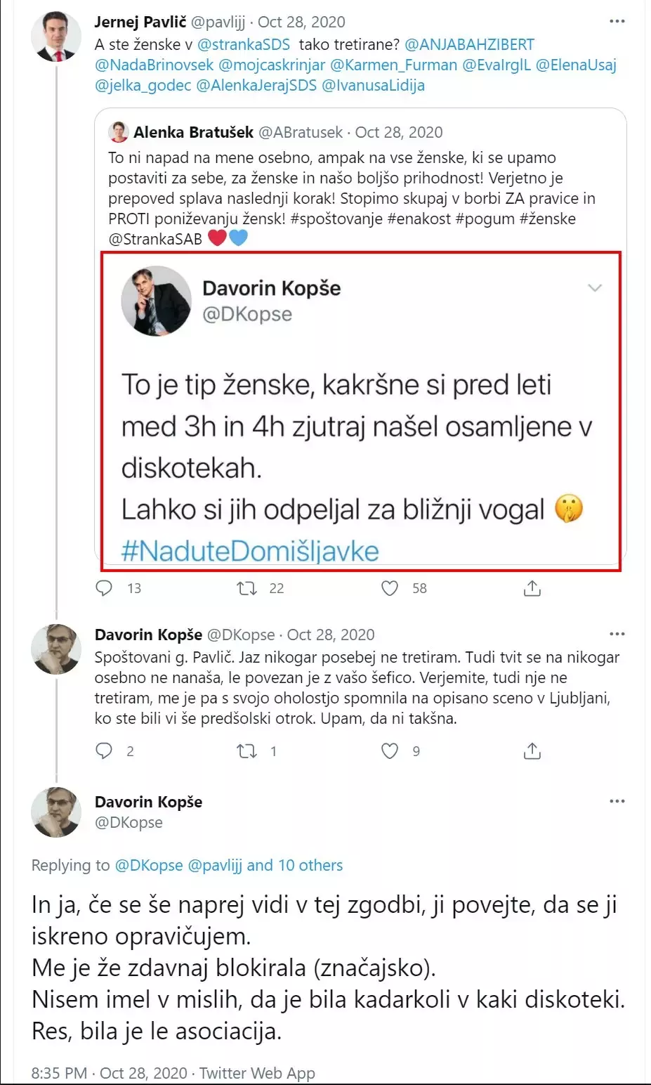 Zatrdil je, da je bila v dokaznem postopku jasno izražena kršitev dostojanstva in časti tožeče stranke Bratušek, kar naj bi bilo razvidno iz objave tvita in kasneje ponovitvijo objave istega, po njegovem kritičnega, tvita. Izpostavil je, da so bile Alenki Bratušek povzročene bolečine (te v postopku niso bile nikjer opisane oz. ni povedala kako so se odražale; op. p.). Povedal je, da mu je jasno kako je pravda na sodišču dokazala kršitev njenega dostojanstva (ampak ona je postopek sama sprožila, zato si je bolečine, če jih je res utrpela, povzročila sama; op. p.).