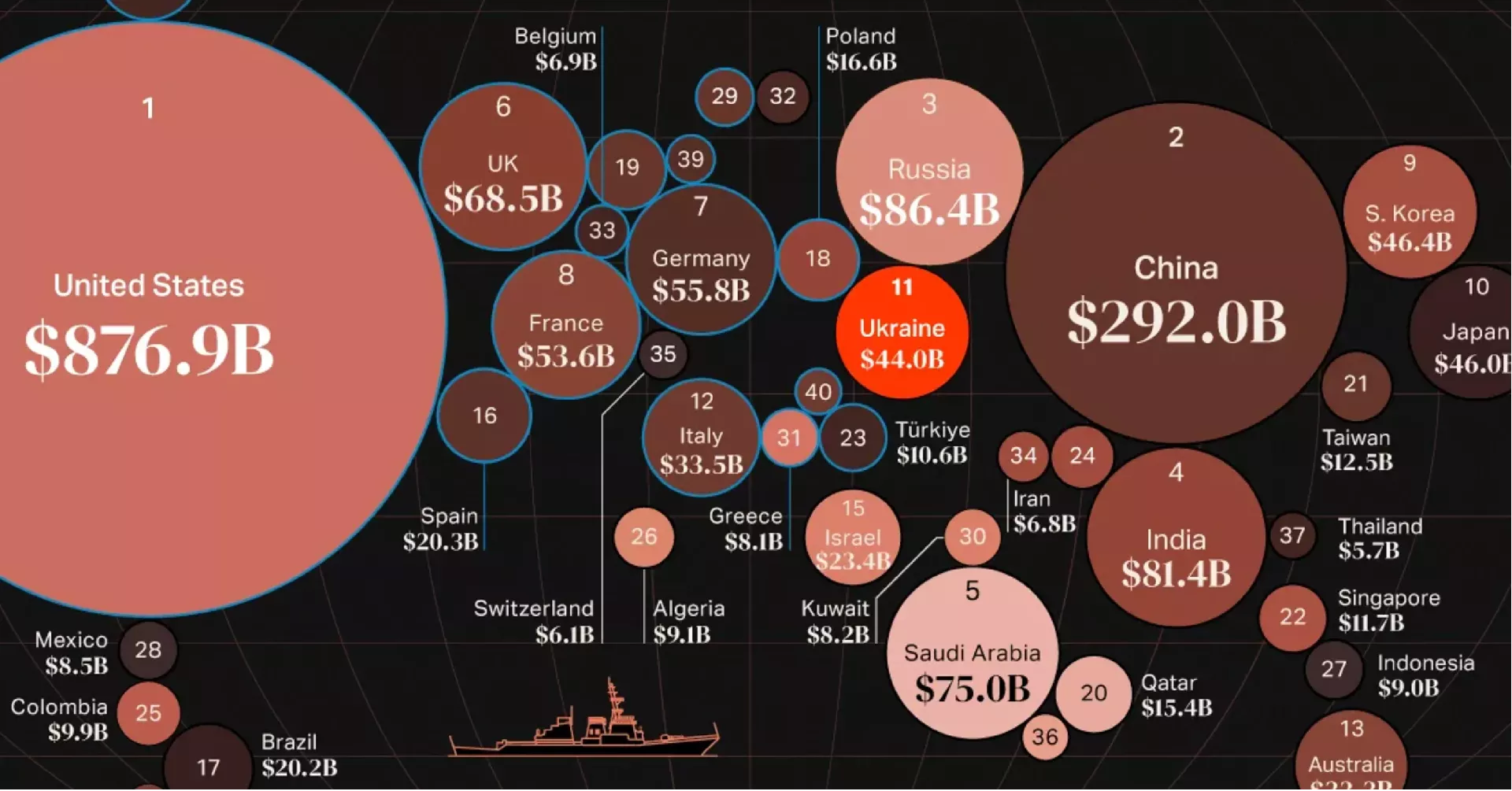 ZDA: Približno 880 milijard $ (2023), kar je skoraj 40 % svetovne vojaške porabe