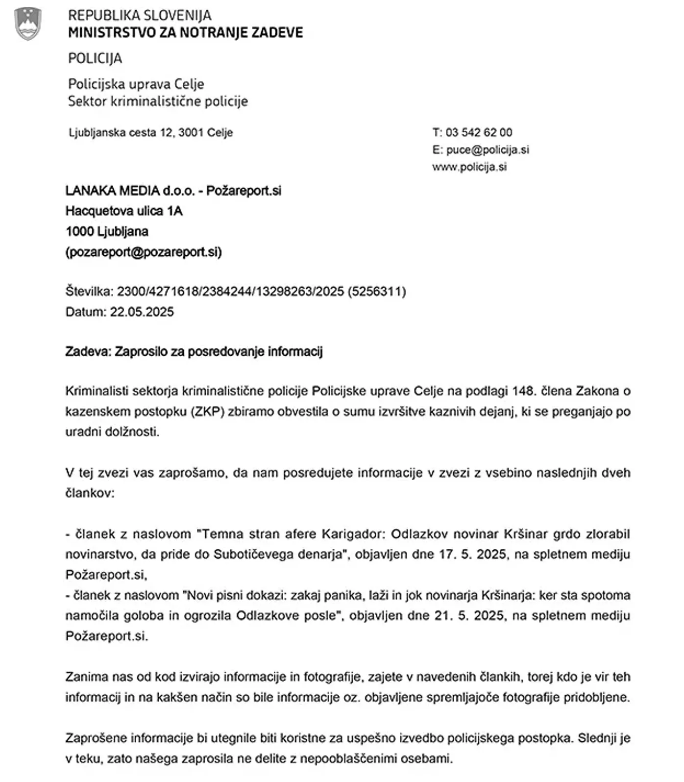 Nenavaden dopis policijske uprave s pozivom k razkritju virov: