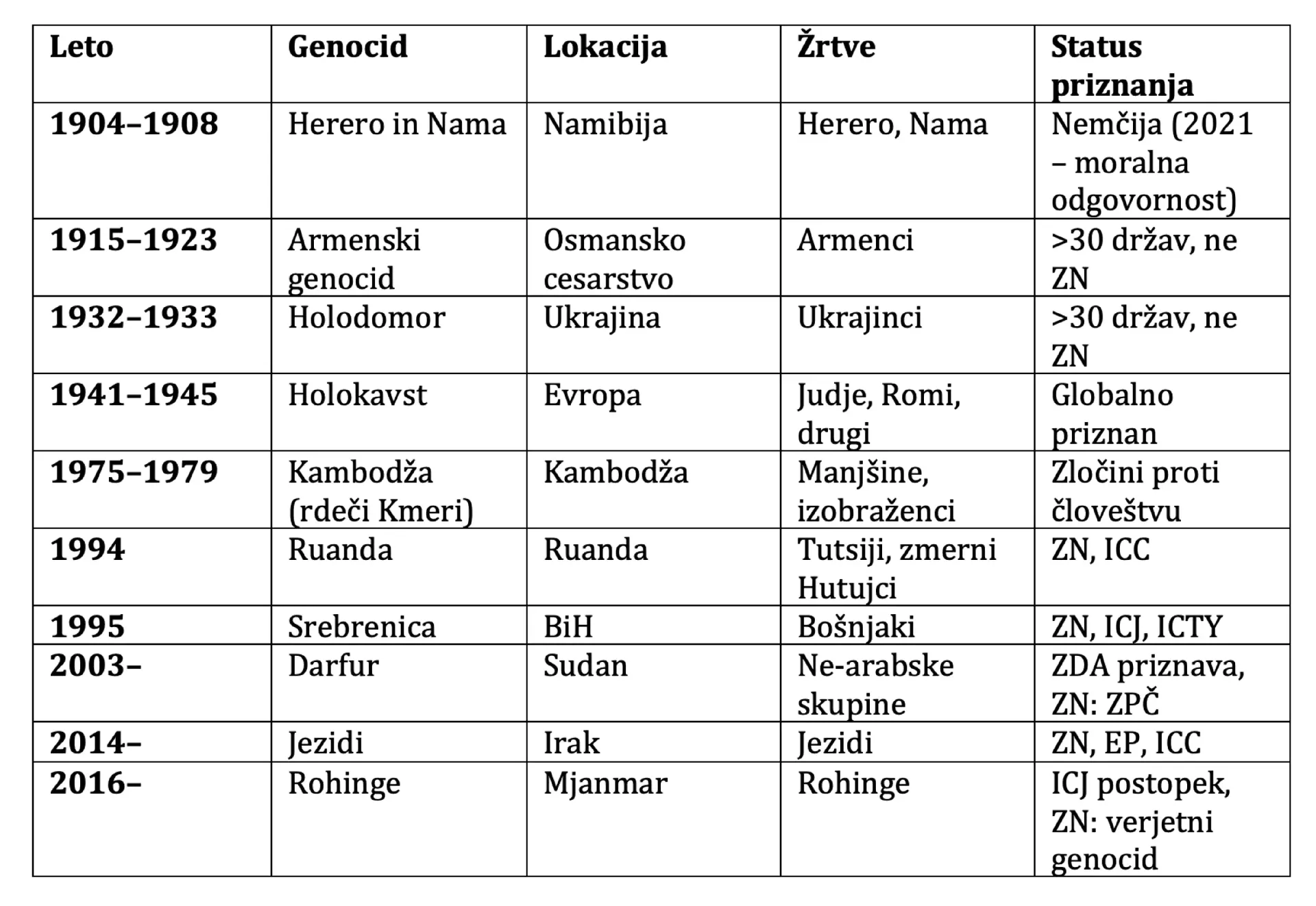 - Evropa: Holokavst, Srebrenica, Holodomor, Armenski genocid